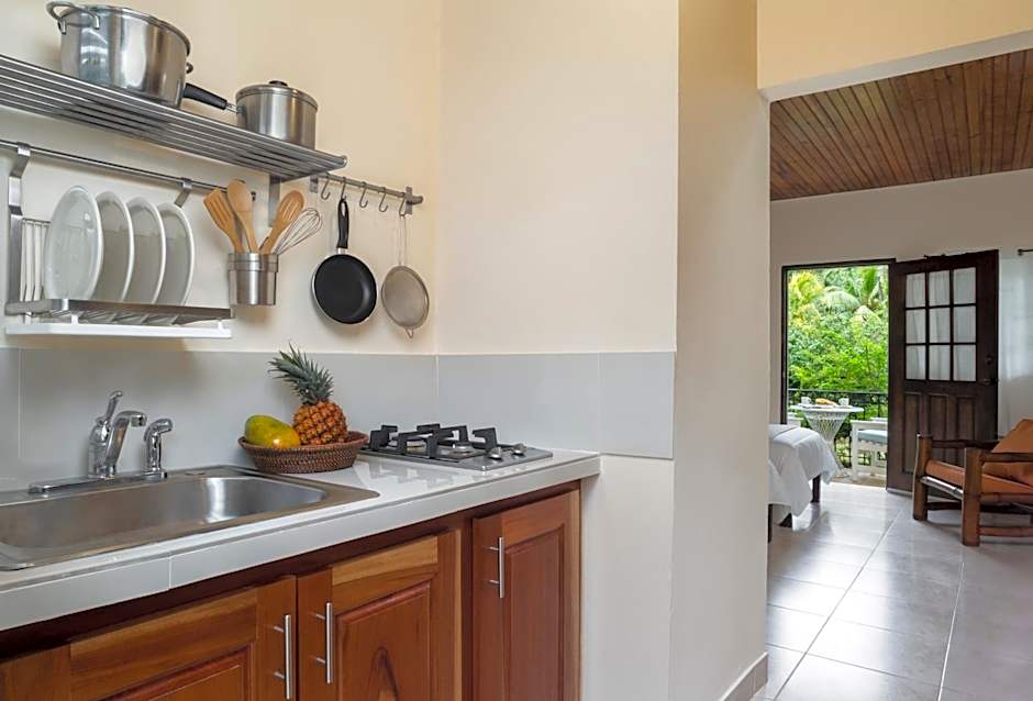 Located on the beach side of the property. Garden view room with living room, dining room and fully equipped kitchen with 4 burner stove, microwave and large refrigerator. Bedroom has air-conditioning with 32” flat panel TV. Private porch in front of apartment. All units located on the ground floor. Free WiFi.